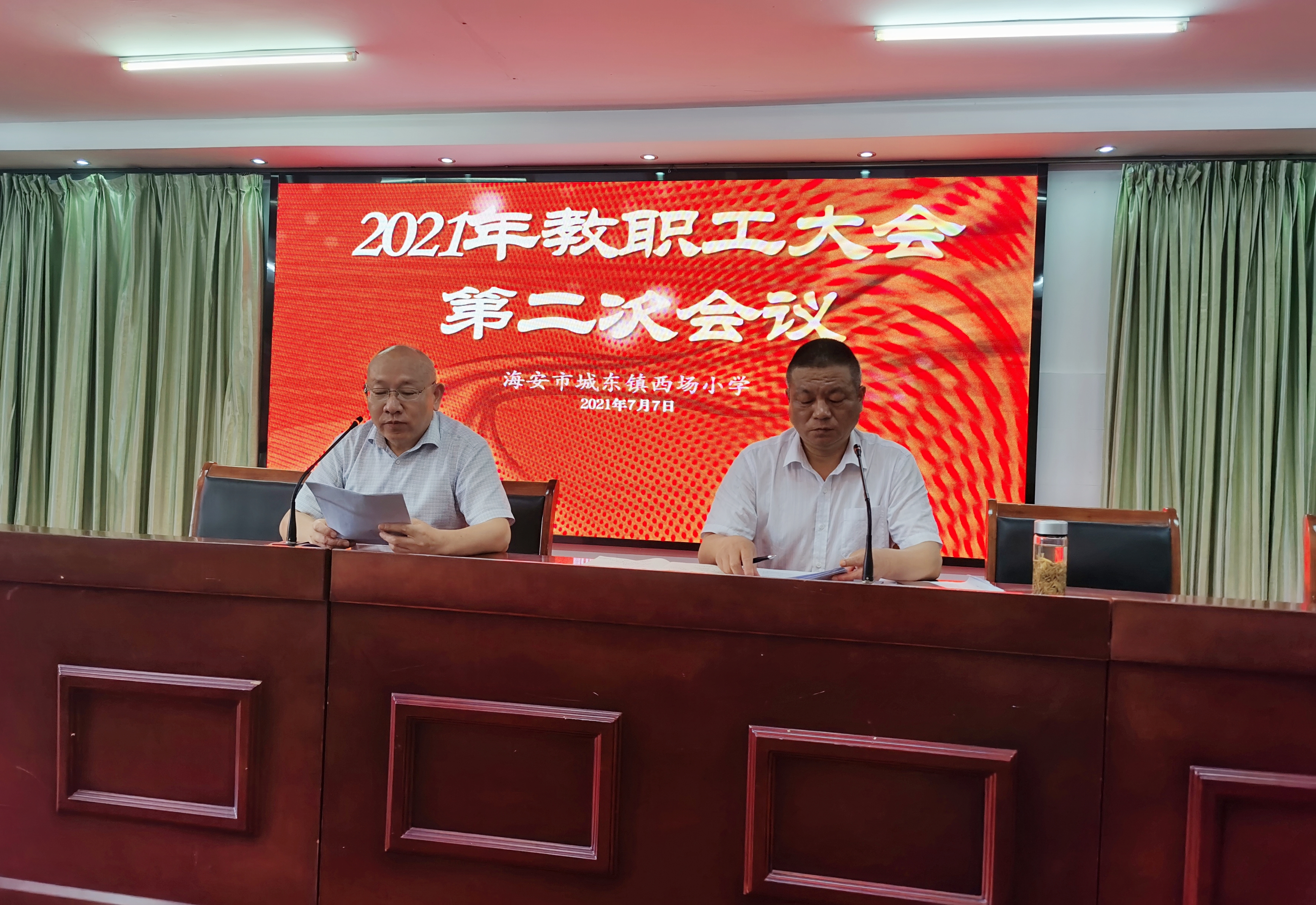 2021年7月7日下午,在庄严的国歌声中,海安市城东镇西场小学全体教职工迎来了政治生活中的一件大事,2021年全体教职工大会第二次会议胜利召开了!这是西场小学教职工民主参与学校管理,发扬主人翁意识的重要表现。大会由分工会主席申春华同志主持。